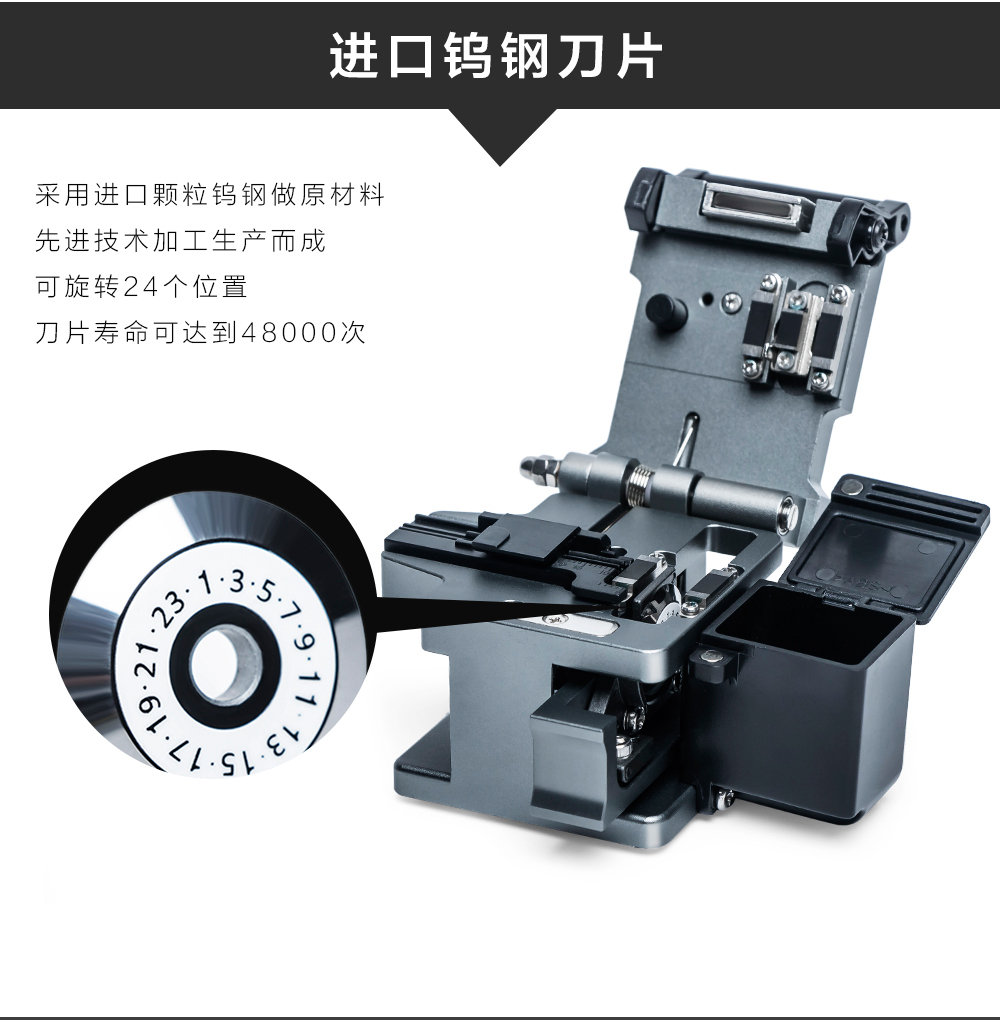 切割過程操作簡便,切割精確,斷面平整,適用適用于250um~900um被覆光纖,刀片壽命可高達(dá)48000次。